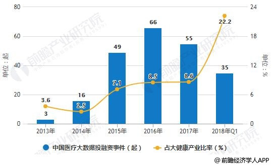 2013-2018年Q1中國醫(yī)療大數(shù)據(jù)投融資事件及占大健康產(chǎn)業(yè)比率統(tǒng)計情況