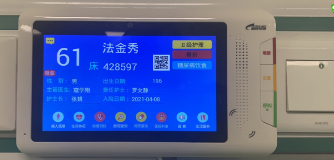 入住科室的第一天,護(hù)士會(huì)對(duì)患者進(jìn)行“入院宣教”,除了正常的住院注意事項(xiàng)外,還專門(mén)指導(dǎo)患者學(xué)會(huì)了病床上方患者端的“ 智能電子床頭屏”,它是患者住院期間的信息小助手,通過(guò)它不僅可以查詢患者的體征數(shù)據(jù)、護(hù)理事項(xiàng)、住院費(fèi)用、檢查項(xiàng)目預(yù)約情況、住院及治療須知等豐富信息,還可以提供點(diǎn)餐、醫(yī)療服務(wù)評(píng)價(jià)等服務(wù)。