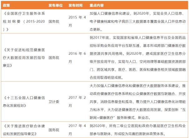 事實上,自2015年4月,國務院發(fā)布《全國醫(yī)療衛(wèi)生服務體系規(guī)劃綱要(2015-2020)》,提出加強人口健康信息化建設,到2020年,實現(xiàn)全員人口信息、電子健康檔案和電子病歷三大數(shù)據(jù)基本覆蓋全國人口并信息動態(tài)更新,我國陸續(xù)出臺了一系列加速醫(yī)療信息化產(chǎn)業(yè)發(fā)展的政策。